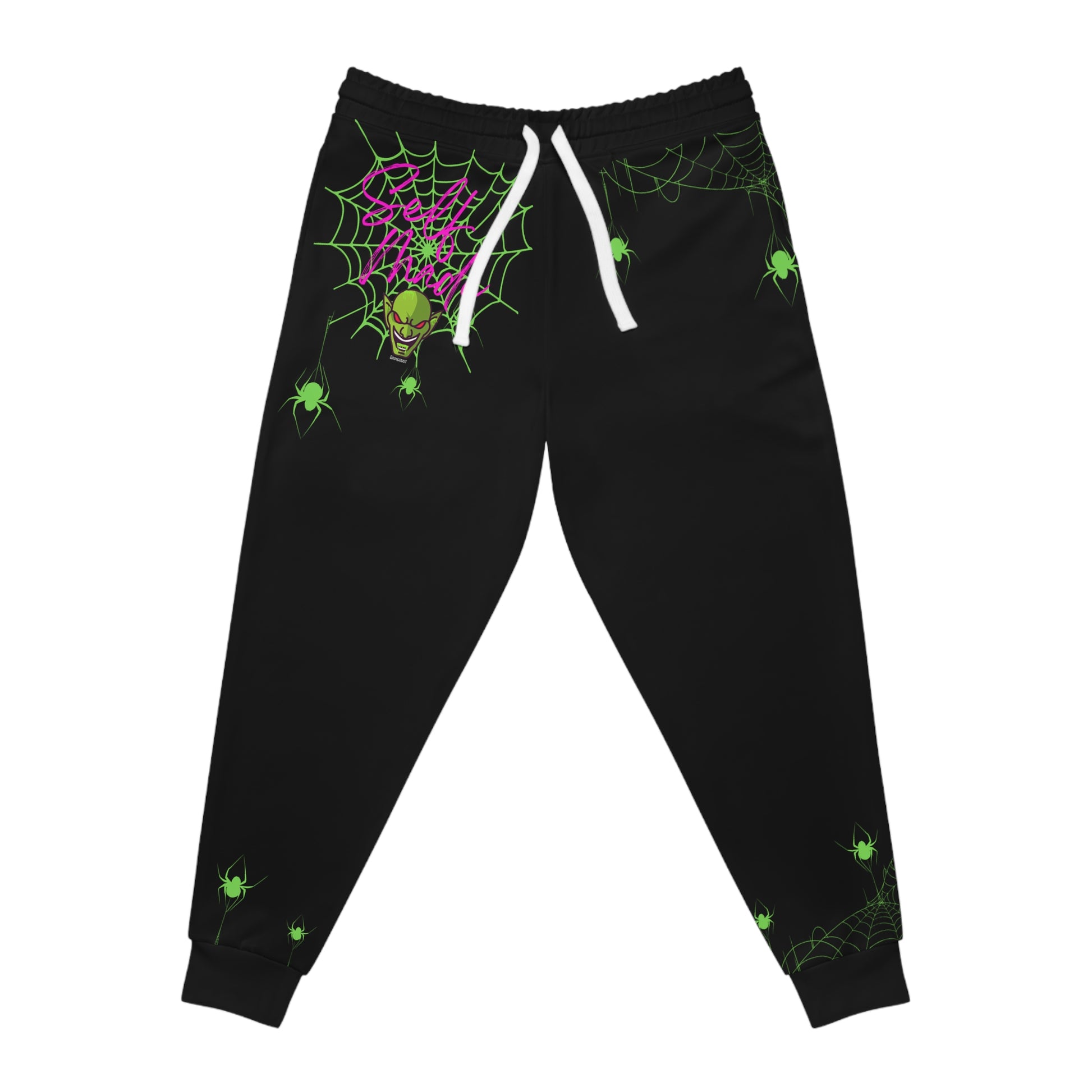 The "Self Made" pairing is perfect - Grimegeist's energy screams rebellion, confidence, and power. Villian engery meets succes mindset. Embrace comfort and style with these Athletic Joggers, perfect for both lounging and active pursuits. Crafted from a soft blend of 95% polyester and 5% spandex, these joggers offer a lightweight feel and flexibility. The eye-catching all-over print adds a unique flair, making them a standout addition to your wardrobe. Perfect for a casual day out, cozy evenings at home, or workout sessions at the gym. Ideal for fitness enthusiasts, trendsetters, and anyone who values comfort with a twist. These joggers are perfect for Halloween festivities or just to add a touch of fun to your everyday attire!